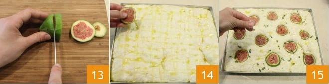 In der Zwischenzeit die Feigen gründlich waschen und in 1 cm dicke Scheiben schneiden, ohne sie zu schälen 13. Die aufgegangene Focaccia wieder aufnehmen, die Oberfläche mit Olivenöl bestreichen und die Feigenscheiben darauf verteilen 14, dabei leicht andrücken, damit sie gut am Teig haften. Mit Thymian würzen 15,