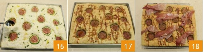 die Oberfläche mit Honig 16 und grobem Salz bestreuen. In einem vorgeheizten statischen Ofen bei 180° für 35 Minuten backen (oder bei 160° für 25 Minuten im Umluftofen). Wenn die Focaccia goldbraun ist, aus dem Ofen nehmen 17, etwas abkühlen lassen, dann mit den Schinkenscheiben und einem weiteren Schuss Honig belegen und Ihre Focaccia mit rohem Schinken und Feigen servieren 18!