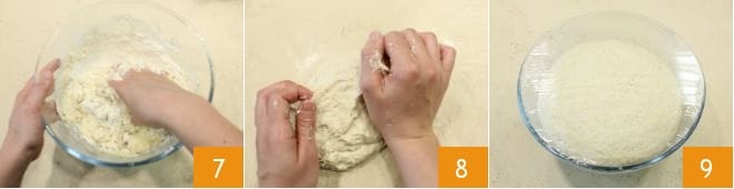 Alles mit den Händen direkt in der Schüssel kneten 7, wenn alle Zutaten aufgenommen sind, auf eine leicht bemehlte Arbeitsfläche geben 8. Den Teig bearbeiten, bis er glatt und elastisch ist, ihm eine kugelförmige Form geben und in eine Schüssel legen, mit Frischhaltefolie abdecken und 2 Stunden im ausgeschalteten Ofen mit eingeschaltetem Licht oder in einem warmen, zugluftgeschützten Raum gehen lassen. Nach der Gehzeit den Teig wieder aufnehmen, der sein Volumen verdoppelt hat 9,