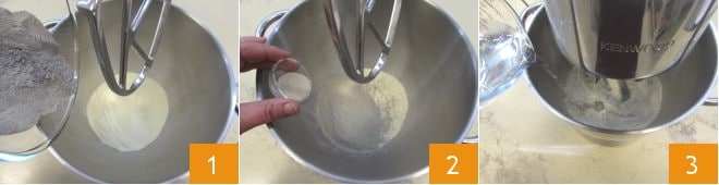 Um das Focaccia aus geröstetem Weizenmehl gefüllt mit Oliven und getrockneten Tomaten zuzubereiten, beginnen Sie mit dem Teig für das Focaccia. Geben Sie die beiden Mehle 1 in die Rührschüssel der Knetmaschine mit dem Knethaken und fügen Sie auch die Hefe 2 und das Wasser 3 hinzu, wobei Sie genug zurückhalten, um das Salz darin aufzulösen. Beginnen Sie mit dem Kneten.