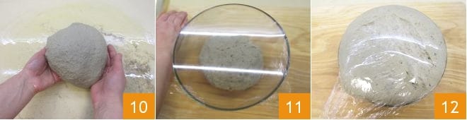 Den Teig mit der glatten Seite nach oben drehen 10 und in eine mit Öl eingefettete Schüssel geben und mit Frischhaltefolie abdecken 11. Bei einer Temperatur von 28° eine Stunde gehen lassen, dann über Nacht in den Kühlschrank geben. Nach der Gehzeit ist der Teig gut aufgegangen 12. Lassen Sie ihn vor der Verwendung ein paar Stunden bei Raumtemperatur.