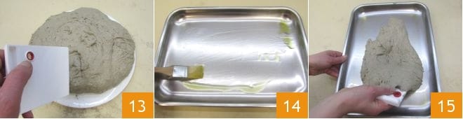 Nach der Zeit den Teig mit Hilfe eines Teigschabers in zwei Teile teilen, einen etwas größer als den anderen 13. Die Form, in der Sie Ihr Focaccia zubereiten werden, mit Öl einpinseln 14, den größeren Teil nehmen und in die geölte Form geben 15.