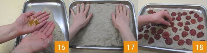 Auch die Hände mit etwas Öl einölen 16 und den Boden des Focaccia ausbreiten, indem Sie den Teig mit den Fingerspitzen in Richtung der Ränder der Form drücken 17, bis er sie bedeckt. Die getrockneten Tomaten auf dem ausgebreiteten Boden verteilen 18.