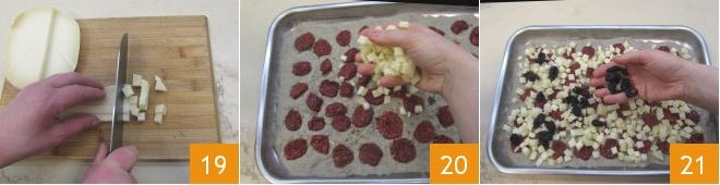 Den Caciocavallo in etwa 1 cm große Würfel schneiden 19 und ebenfalls auf dem Focaccia verteilen 20. Zum Schluss die entkernten Oliven hinzufügen 21.
