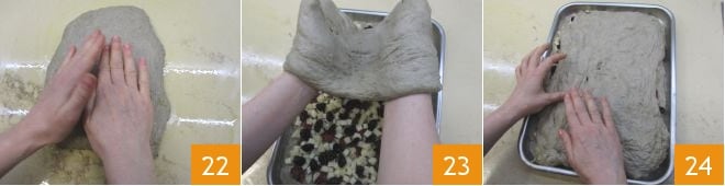 Nehmen Sie jetzt den kleineren Teil des Teigs, den Sie beiseite gestellt hatten. Auf der mit Öl geölten Arbeitsfläche den Teig mit den Händen ausbreiten 22 und, einmal ausgebreitet, anheben und in die Form setzen 23, sanft ausbreiten, um die Füllung zu bedecken 24.