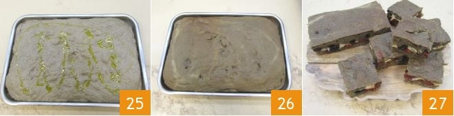 Einen Schuss Öl (die restlichen 10 g) auf die Oberfläche Ihres Focaccia gießen 25 und es für 40 Minuten in einem vorgeheizten statischen Ofen bei 190° backen. Das Focaccia aus geröstetem Weizenmehl gefüllt mit Oliven und getrockneten Tomaten aus dem Ofen nehmen 26 und sofort in Quadrate schneiden 27!
