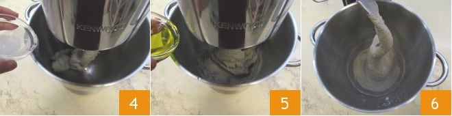 Geben Sie dann das im Wasser gelöste Salz 4 in die Rührschüssel und 50 g Öl in einem dünnen Strahl 5. Kneten Sie weiter für etwa 10 Minuten 6.