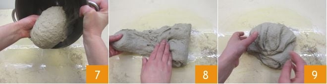 Nach dieser Zeit wird der Teig noch sehr weich sein und sich nicht von den Wänden der Rührschüssel lösen: Mit Hilfe eines Teigschabers den Teig auf die gut geölte Arbeitsfläche stürzen 7 und ihn durch Strecken auf der Fläche und dann Falten über sich selbst, erst horizontal 8 und dann vertikal 9, bis ein Paket entsteht, bearbeiten.