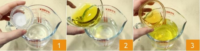 Um den süßen Fladen mit Aprikosen zuzubereiten, geben Sie das Wasser in einen Krug, fügen Sie das Salz 1, den Honig 2 und das native Olivenöl extra 3 hinzu.