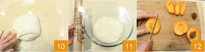 geben Sie dem Teig eine kugelförmige Gestalt 10 und legen Sie ihn dann in eine Schüssel, die mit Frischhaltefolie abgedeckt ist 11, und lassen Sie ihn etwa 2 Stunden im ausgeschalteten Ofen mit eingeschaltetem Licht aufgehen. In der Zwischenzeit waschen Sie das Obst, schneiden Sie die Aprikosen in 1,5 cm dicke Scheiben und entfernen Sie den Stein 12