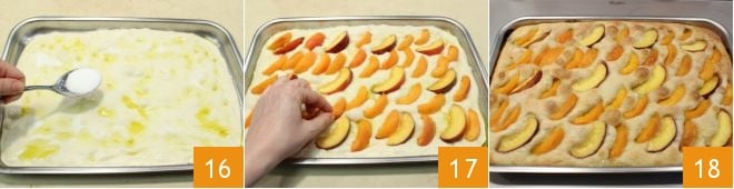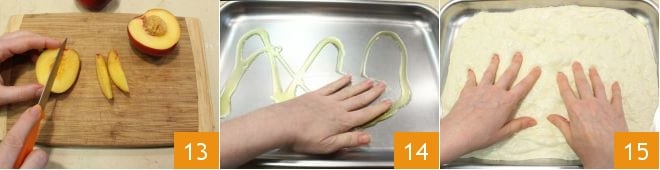 machen Sie dasselbe mit den Pfirsichen 13. Fettem Sie ein Blech der Größe 40 x 30 cm mit Öl ein 14. Wenn der Teig aufgegangen ist, verteilen Sie ihn auf dem Blech, indem Sie ihn leicht mit den Händen drücken. Machen Sie mit den Fingerspitzen Löcher in die Oberfläche des Teigs 15