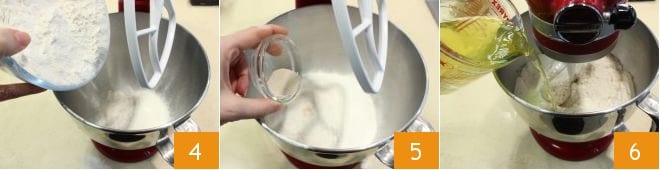 In der Schale einer Küchenmaschine mit Flachrührer sieben Sie das Mehl (Sie können Manitoba-Mehl oder Typ 0 Mehl verwenden) 4 und fügen die Trockenhefe 5 hinzu. Schalten Sie die Maschine ein und geben Sie die Flüssigkeiten hinzu 6