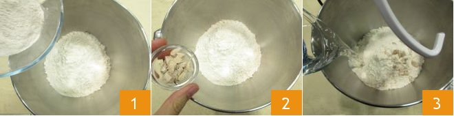 Um die Focaccia mit Kapern, Rosmarin und Taggiasca-Oliven zuzubereiten, geben Sie das Mehl 00 und das Manitoba-Mehl in die Schüssel einer Küchenmaschine mit Knethaken 1, fügen Sie die frische zerbröckelte Hefe hinzu 2 und geben Sie die Hälfte des im Rezept angegebenen Wassers bei Raumtemperatur hinzu 3.