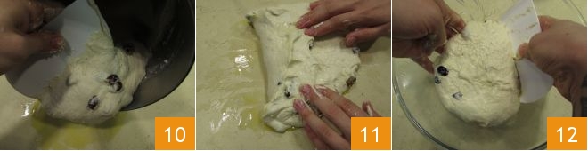 kippen Sie hier den Teig mit Hilfe eines Teigschabers aus 10, der Teig wird sich ziemlich feucht anfühlen. Jetzt falten Sie den Teig einige Male, indem Sie die Ränder zur Mitte hin zusammenführen 11 und ihm eine kugelförmige Gestalt geben; dann legen Sie ihn in eine Schüssel 12.