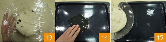 Decken Sie ihn mit Frischhaltefolie ab 13 und lassen Sie den Teig eine Stunde im ausgeschalteten Ofen mit eingeschaltetem Licht gehen. In der Zwischenzeit ölen Sie ein Backblech mit dem Olivenöl ein (aus der Menge zum Würzen) 14, dann geben Sie den Teig auf das Blech 15