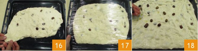 und ziehen ihn mit den Fingerspitzen, um ihn gleichmäßig in der Form zu verteilen 16. Decken Sie das Blech mit Frischhaltefolie ab 17 und lassen Sie es eine weitere Stunde im ausgeschalteten Ofen mit eingeschaltetem Licht gehen. Nach der zweiten Gehzeit belegen Sie die Focaccia mit den abgetropften Taggiasca-Oliven 18
