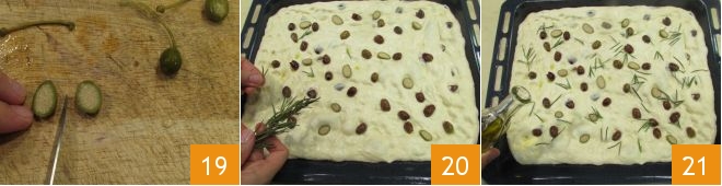 Schneiden Sie die Kapernfrüchte in zwei Hälften 19 und verteilen Sie sie ebenfalls auf der Oberfläche der Focaccia, aromatisieren Sie mit den Rosmarinnadeln 20 und geben Sie das restliche Olivenöl darüber 21.