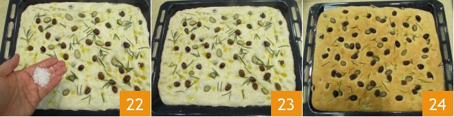 Zum Schluss verteilen Sie auch die Salzflocken darüber 22. Die Focaccia ist bereit zum Backen 23: backen Sie sie im vorgeheizten statischen Ofen bei 200°C für 30-35 Minuten, achten Sie darauf, einen Topf mit heißem Wasser im Ofen zu platzieren, um den richtigen Feuchtigkeitsgrad beim Backen zu gewährleisten. Nach der Backzeit nehmen Sie die Focaccia mit Kapern, Rosmarin und Taggiasca-Oliven 24 aus dem Ofen, lassen Sie sie abkühlen und servieren Sie sie dann!