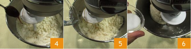 Schalten Sie die Küchenmaschine auf niedriger Geschwindigkeit ein und fügen Sie auch das Malz hinzu (alternativ können Sie einen Teelöffel Zucker verwenden). Geben Sie dann nach und nach das restliche Wasser hinzu 5, das Salz 6