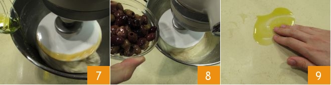 und schließlich auch das Olivenöl nach und nach 7, kneten Sie für 10-15 Minuten, bis sich der Teig am Haken festgesetzt hat, und fügen Sie dann auch die Hälfte der abgetropften Taggiasca-Oliven aus ihrem Einlegeöl hinzu 8 und mischen Sie weitere 10 Sekunden mit der Küchenmaschine, genug Zeit, um die Oliven einzuarbeiten. Schalten Sie die Küchenmaschine aus, ölen Sie eine Arbeitsfläche leicht ein 9,