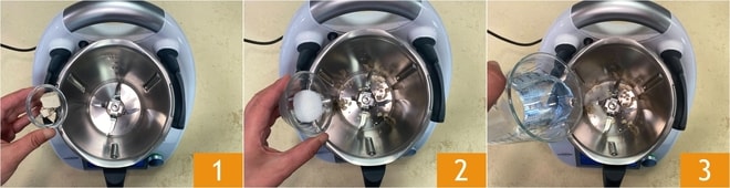 Um die Focaccia mit Tomaten und Oliven mit Bimby® zuzubereiten, geben Sie die Hefe 1, den Zucker 2 und 100 g Wasser 3 in den Mixtopf. Lösen Sie die Hefe für 2 Minuten bei 37° auf, indem Sie die Geschwindigkeit 2 einstellen.