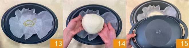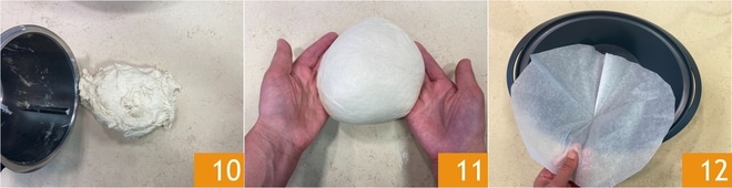 Übertragen Sie den Teig auf eine bemehlte Arbeitsfläche 10 und formen Sie eine glatte und homogene Kugel 11. In der Zwischenzeit legen Sie den Varoma-Behälter mit einem Blatt Backpapier aus 12.