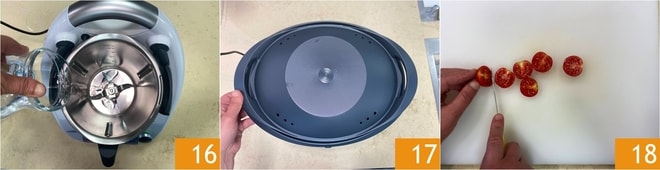 Geben Sie 250 g Wasser 16 und den Zitronensaft in den Mixtopf, schließen Sie mit dem Deckel und platzieren Sie den Varoma darauf 17. Stellen Sie das Gärprogramm für 2 Stunden bei 37° ein. Waschen Sie nun die Tomaten und schneiden Sie sie in Hälften, zur Seite legen 18.