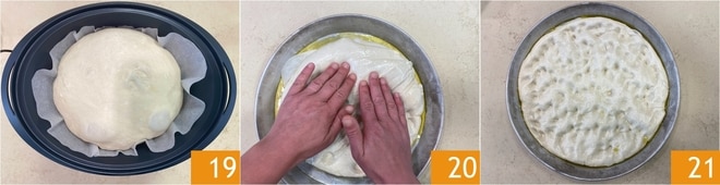 Sobald die Gärung abgeschlossen ist, entfernen Sie vorsichtig den Varoma 19. Geben Sie den Teig in eine geölte Form mit einem Durchmesser von 32 cm und verteilen Sie ihn mit den Händen 20. Drücken Sie mit den Fingerspitzen in den Teig, um Vertiefungen zu schaffen 21.