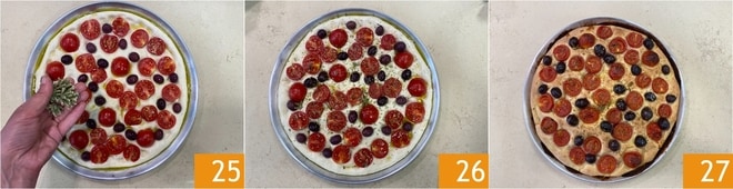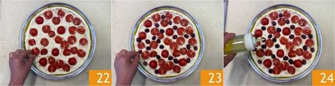 Platzieren Sie die Tomaten darauf und drücken Sie leicht 22, dann machen Sie dasselbe mit den Oliven 23. Salzen Sie die Oberfläche und würzen Sie mit reichlich Öl 24.