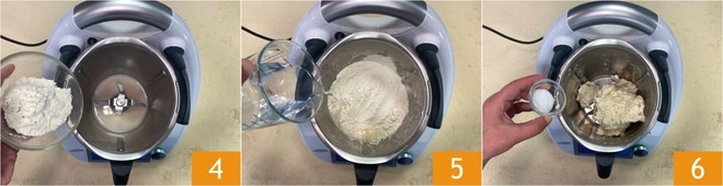 Fügen Sie 50 g Mehl Type 00 4 hinzu und vermischen Sie es eine Minute lang bei Geschwindigkeit 3. Lassen Sie es 10 Minuten im Mixtopf ruhen. Fügen Sie den Rest des Mehls hinzu und gießen Sie die weiteren 200 g Wasser 5 ein, dann kneten Sie mit der Knetfunktion für 2 Minuten. Fügen Sie nun die 10 g Salz 6 hinzu.