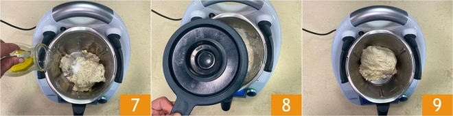 Gießen Sie die 35 g natives Olivenöl extra 7 ein und kneten Sie erneut mit der Knetfunktion für 2 Minuten 8 9.