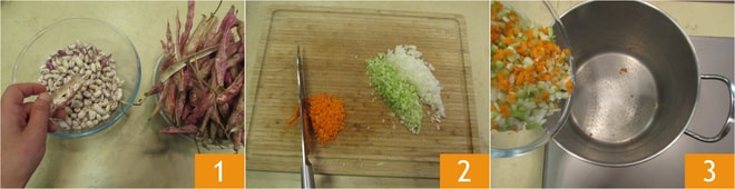 Um die Frantoiana-Suppe zuzubereiten, bereite zuerst das Bohnenpüree zu: Schäle die Bohnen 1, so erhältst du etwa 250 g. Hacke grob einen Stangensellerie, eine Möhre und eine Zwiebel und gib sie in einen großen Topf 3.