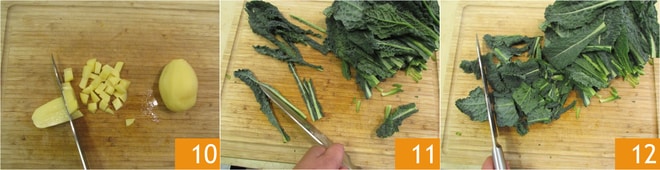 Schäle und schneide auch die Kartoffeln 1 und die restliche Möhre in Würfel. Entferne den mittleren Strunk des Schwarzkohls 11 und schneide ihn in Stücke 12.