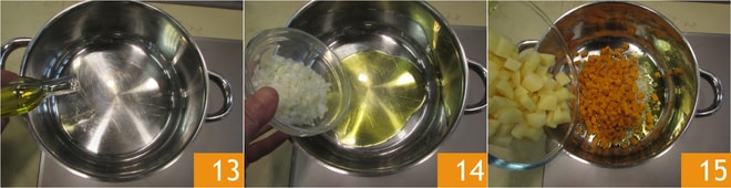 Bereite in einem großen Topf ein Sofrito mit nativem Olivenöl extra 13 und der gehackten Zwiebel 14 zu und füge das in Stücke geschnittene Gemüse hinzu 15.