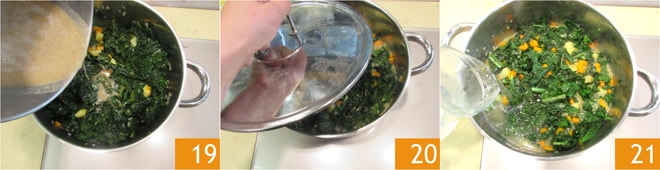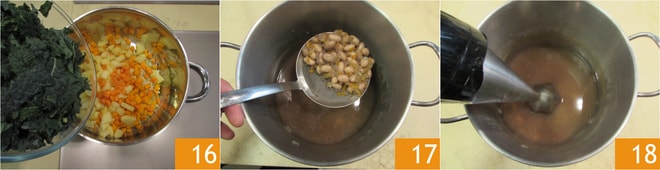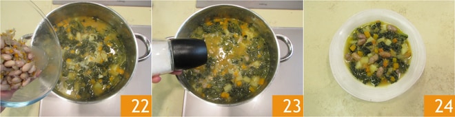 Füge auch den Kohl hinzu 16. Lasse es einige Minuten anbraten. In der Zwischenzeit nimmst du einige gekochte Bohnen heraus 17 und legst sie beiseite. Püriere den Rest zusammen mit dem Gemüse und ihrem Kochwasser, um eine gleichmäßige Creme zu erhalten 18.
