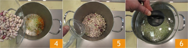 Gib auch die Borlotti-Bohnen hinzu. Bedecke sie mit kaltem Wasser 5, etwa 1,2 Liter, und bringe sie zum Kochen. Koche sie bei niedriger Hitze, halb abgedeckt 6, bis sie weich sind.