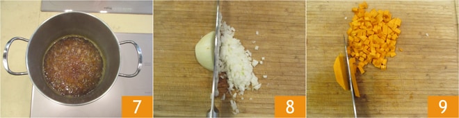Dies dauert etwa eine halbe Stunde 7. In der Zwischenzeit schäle und hacke die zweite Zwiebel 8, schäle und schneide den Kürbis in Würfel 9.