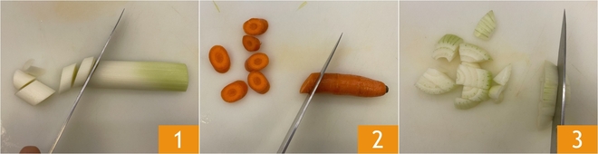 Um die Zwiebelsuppe zuzubereiten, bereiten Sie zuerst den weißen Hühnerfond vor: Putzen Sie den Lauch und schneiden Sie ihn grob in Stücke 1, dann machen Sie dasselbe mit der Karotte 2 und der Zwiebel 3.