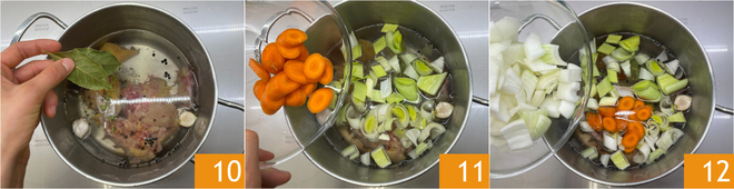Fügen Sie schließlich die Lorbeerblätter 10, den Lauch, die Karotten 11 und die Zwiebel 12 hinzu.