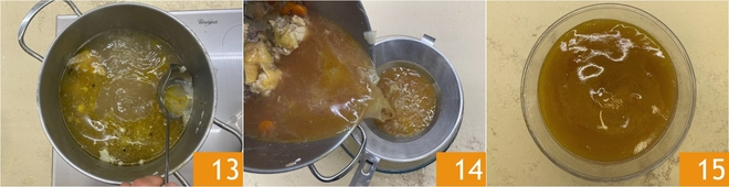 Bringen Sie alles zum Kochen und lassen Sie es mindestens 2 Stunden köcheln, während Sie gelegentlich den Schaum von der Oberfläche abschöpfen, um die Verunreinigungen zu entfernen 13. Wenn fertig, filtern Sie die Flüssigkeit mit einem Sieb 14 und halten Sie sie warm 15; Sie sollten etwa 2 Liter Brühe erhalten.
