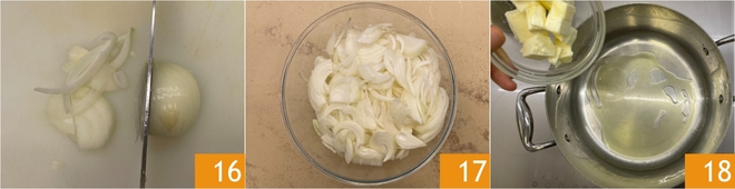 Während die Brühe kocht, können Sie die Zwiebeln putzen und in Julienne-Streifen schneiden 16 17. Lassen Sie in einem großen Topf die Butter mit dem Öl schmelzen 18.