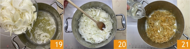 Fügen Sie die Zwiebeln hinzu 19 und kochen Sie sie bei starker Hitze, dabei ständig umrühren, um zu verhindern, dass sie am Boden hängen bleiben 20. Wenn die Zwiebeln karamellisiert sind, löschen Sie mit dem Wein ab 21 und lassen Sie ihn vollständig verdunsten.