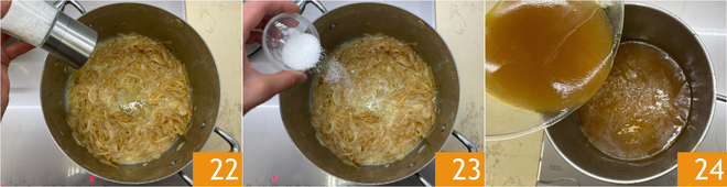 Jetzt fügen Sie das Salz 22 und den Zucker 23 hinzu. Reduzieren Sie die Hitze und kochen Sie für 30 Minuten, dann fügen Sie die heiße Brühe hinzu 24.