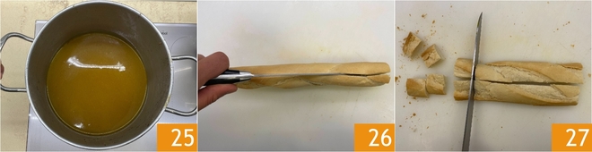 Kochen Sie für 20 Minuten bei mittlerer Hitze 25. In der Zwischenzeit bereiten Sie die Croûtons vor: Teilen Sie das Baguette der Länge nach in der Mitte 26, dann nochmals in der Mitte. Schneiden Sie es schließlich in Würfel 27.