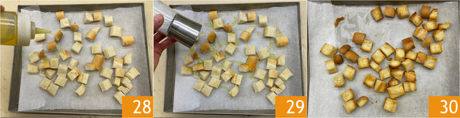 Verteilen Sie die Brotwürfel auf einem mit Backpapier ausgelegten Backblech und würzen Sie mit Öl 28 und Salz 29. Rösten Sie das Brot im vorgeheizten Umluftofen bei 190° für 5 Minuten 30.