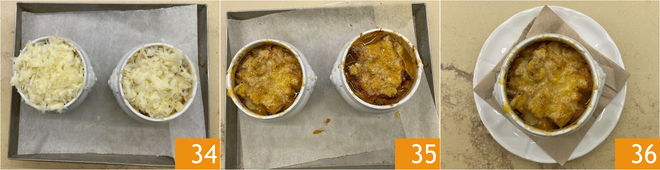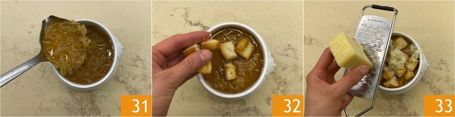 Nach der Garzeit können Sie die Zwiebelsuppe in den Cocotten anrichten, dabei achten Sie darauf, dass die Menge der Brühe gleich der der Zwiebeln ist 31. Legen Sie die Croûtons darauf 32 und reiben Sie reichlich Gruyère 33.