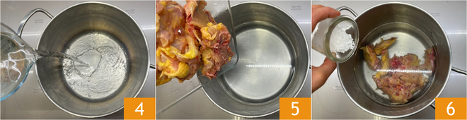 Gießen Sie kaltes Wasser in einen großen Topf 4, dann fügen Sie die Hühnerkarkassen 5 und das grobe Salz 6 hinzu.