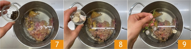 Aromatisieren Sie mit den Pfefferkörnern 7, den Knoblauchzehen 8 und dem Thymianzweig 9.