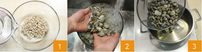 Um die Fregola mit Venusmuscheln und Kichererbsen zuzubereiten, sollten Sie die Kichererbsen mindestens 12 Stunden (oder eine ganze Nacht) in einer mit Wasser gefüllten Schüssel rehydrieren lassen 1. Dann die Kichererbsen abgießen, die nach den Einweichstunden rehydriert sind, und in Salzwasser kochen, bis sie weich sind (es dauert etwa ein paar Stunden) (alternativ können Sie die Kichererbsen noch trocken mit Salz und Rosmarin im Schnellkochtopf etwa 50 Minuten kochen). Um die Venusmuscheln kümmern, sie abspülen 2 und dann in ein Sieb mit einer Schüssel darunter unter einem Wasserstrahl etwa 30 Minuten liegen lassen, um den Sand zu entfernen. In einem Topf etwas Öl und ein paar Knoblauchzehen geben, die Venusmuscheln hinzufügen 3, mit einem Deckel abdecken und kochen lassen, bis sie sich öffnen.