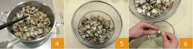 Sobald sie fertig sind, die Knoblauchzehen entfernen 4, abgießen 5 und darauf achten, deren Wasser aufzubewahren, das zum Kochen der Venusmuscheln verwendet wird. Die Muscheln aus der Schale lösen 6 und einige ganz für die Dekoration der Teller beiseitelegen.